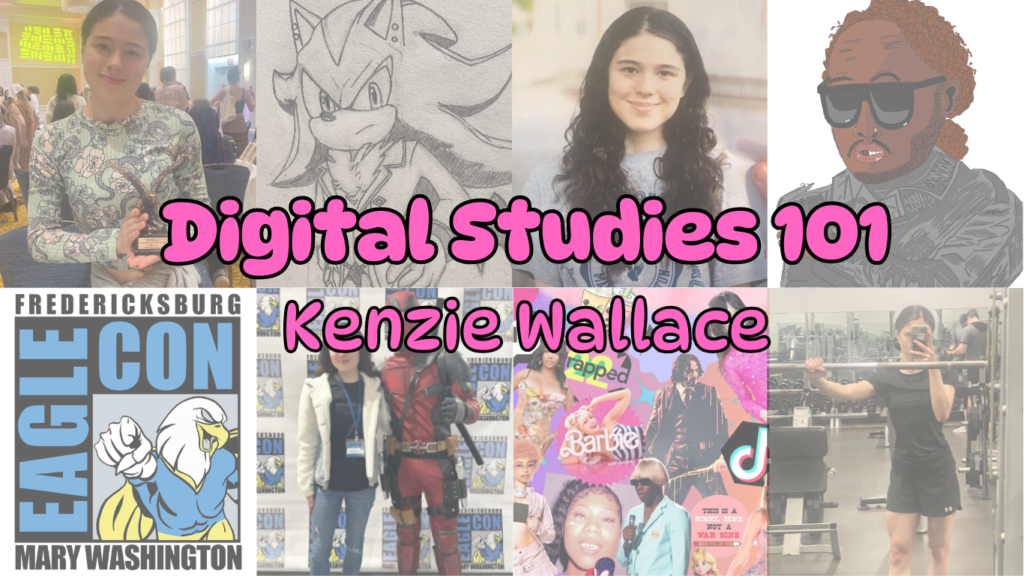 The images I have created include a favicon and three header images for three different pages of my website. The favicon is a digital drawing of a painting palette with the initials “KW” in hot pink text. The header images are rectangle images of collages. The goal of creating my favicon was to make a logo that would encourage a reader to mentally associate my name with the concept of creating. The header image of the homepage displays 4 images of myself at different events (Eagle Con, being an orientation leader, etc.) and 4 editing/art pieces I have made, as well as the name of the website and myself written in pink text in the center. The header image of my “Blog Post” page displays 8 images of editing projects I have created, and the title “Blog Posts”, along with my name written in red text in the center. The header image of the “My Writings” page displays 8 different literary and text-based projects of mine, along with the title “My Writings” and my name written in gold text in the center. My headers were designed to showcase different projects I have made based on their respective pages (ex: The “Blog Posts” page has examples of other digital pieces I have created) while also being simplistic enough to appear as an approachable display of some of my works. Although I created a very simplistic background for the homepage, I decided on a light orange color to compliment the pink from the text of the header page. For all of these pieces, I have created alt text descriptions to make the content more accessible. I also tried to stray away from colors that are commonly difficult for colorblind or visually impaired people to see, such as bright red or green.